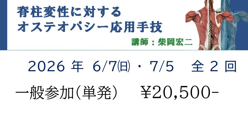 本セミナーでは、柴岡宏二D.O.が脊柱変性に対する応用手技の講義を行います。