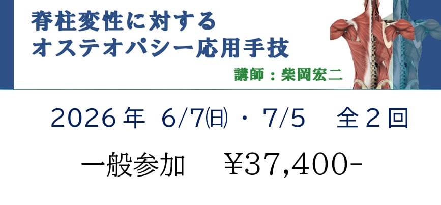 本セミナーでは、柴岡宏二D.O.が脊柱変性に対する応用手技の講義を行います。